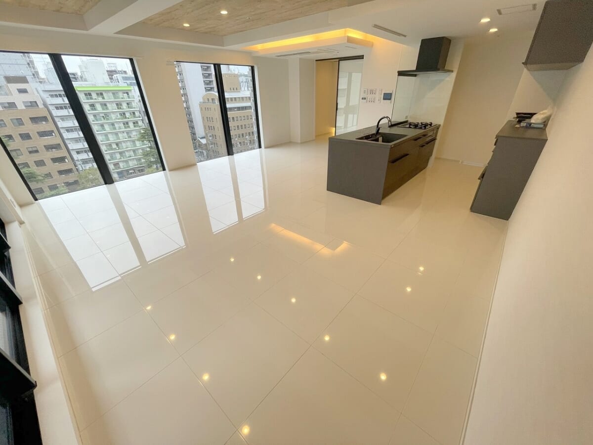 こちらがなんと25帖もある大きなリビングになります!デザイナーズマンションなので間接照明がついていたりフローリングはタイルになております。タイルだと冬が寒そう…と思いましたよね??ご安心ください😌もちろん床暖房もついております🙆🏻‍♀️夏は涼しく冬は暖かく過ごしやすく配慮されています!その中でも私はやはり大きなFIX窓についつい目がいってしまいます❤