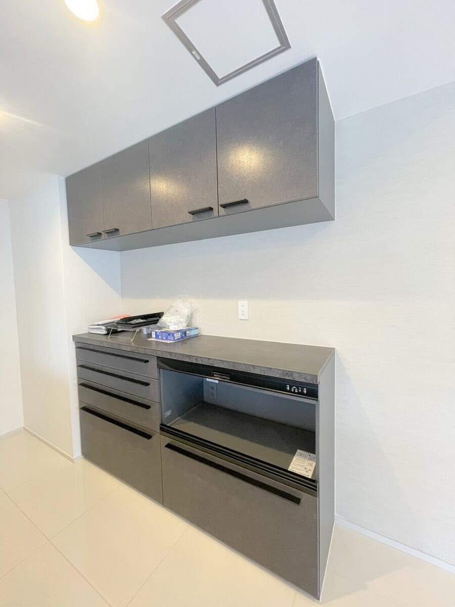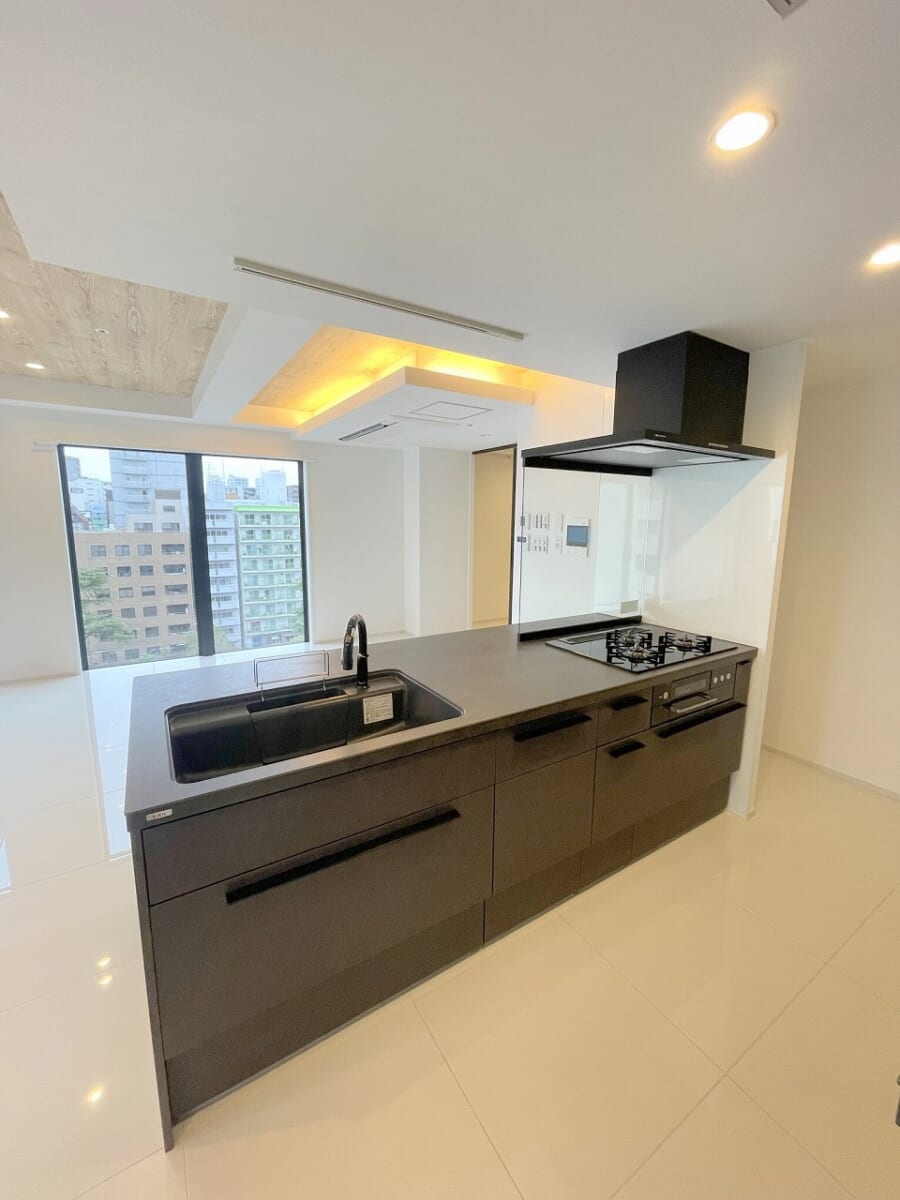 白にはやはり黒が一番合いますよね!シンプルなキッチンでカウンタータイプなのも嬉しいですね😊キッチンの後ろにも棚があるのでご自身で大きな棚を買う必要も無く、お引越しも楽になりコストも抑えれます🙆🏻‍♀️家電もシックな色合いのもので揃えたいですね!