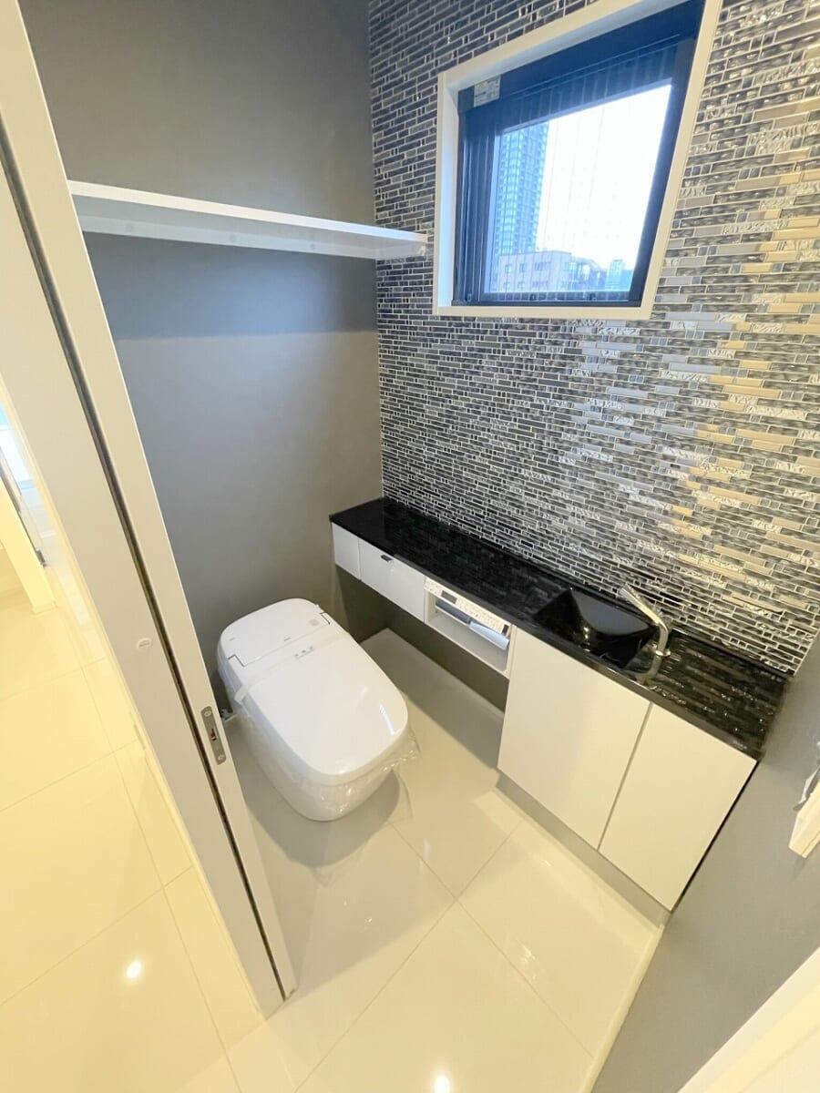 高級感溢れる大理石の大きな三面鏡の洗面台には、収納も沢山ありシンプルなトイレには手洗い場も御座います!