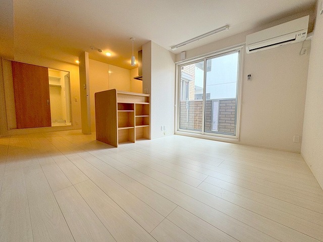 白を基調としたフローリングが、より広さと清潔感を引き立てており、家具のテイストも合わせやすい万能な内装に仕上がっています。また、洗面所までも生活導線がしっかり分けられており、そちらも魅力の一つですね🙆🏻♀️