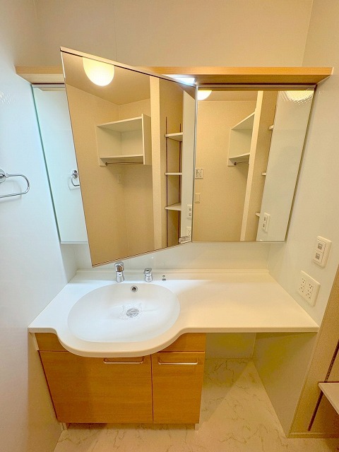 三面鏡タイプの洗面台は、鏡裏にたっぷり収納を備えた人気仕様で、カウンターも広く椅子を収納できるスペースもあるので、女性やお子様には大変助かる構造になっております😌